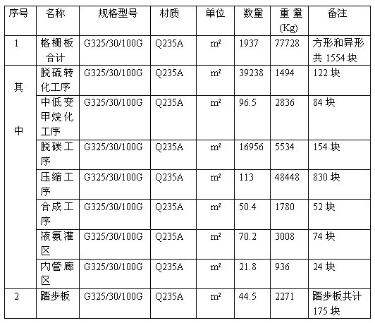 鋼格板由于結構輕、強度高、安裝方便等特點在合成氨項目工程中得到廣泛應用,在壓縮工序、脫硫轉化工序、脫碳工序、平臺液氨罐區等均被大量采用,鋼格板應符合YB/T4001-2007《鋼格柵板及配套件》的標準要求和本技術協議的規定。鋼格板常用32*5的扁鋼制作。