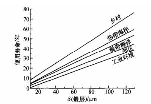 通常熱鍍鋅鋼格板鋅層的使用壽命定義為熱鍍鋅鋼格板表面出現(xiàn) 5%的紅色氧化鐵時(shí)的使用年限。 在這個(gè)使用年限內(nèi) ,鍍鋅鋼格板不會(huì)因腐蝕而損壞。 圖 1是熱鍍鋅鋼在不同大氣環(huán)境條件下的使用壽命。鍍鋅層厚度越大 ,鍍鋅鋼格板的耐腐蝕壽命越長(zhǎng) ; 通常86μm厚鍍層的熱鍍鋅鋼格板在大氣中的使用壽命不低于20年 ;相同鍍層厚度下 ,熱鍍鋅鋼格板在工業(yè)大氣及海洋環(huán)境中的使用壽命較城鄉(xiāng)大氣環(huán)境下更短。 這是由于在工業(yè)及海洋大氣環(huán)境存在著 SO2或 Cl-離子 ,使熱鍍鋅層在較低的大氣相對(duì)濕度下即可發(fā)生電化學(xué)腐蝕 ,且不易形成難溶的、可抑制腐蝕進(jìn)行的腐蝕產(chǎn)物膜。