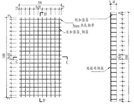 1、由于舞臺透水面板既要求有很高的承載力 ,并且要達到很高透水率要求,因此必須對面板進行結構加強設計。經綜合分析,采用鋼格柵板縱橫向加強肋對面板單元進行結構剛度的加強, 其中鋼格柵板橫向加強肋采用 5mm 厚熱軋鋼帶、縱向加強筋采用 f 10 鋼筋,同一塊鋼格柵板上且平行的加強肋間距 100mm(如圖 1),通過對鋼格柵板加強肋深化設計, 彌補了鋼格柵板開孔對結構剛度的削弱缺陷, 很好地滿足了舞臺安全性要求。