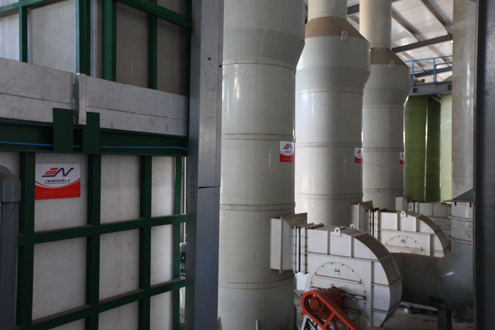 本裝置采用氫氧化鈉溶液為吸收中和液來凈化酸霧廢氣。 氣體由離心通風機壓入或吸入進風段,先由上向下, 然后再由下向上流動, 經(jīng)過第一級濾料層, 與第一級噴淋中和液接觸反應(yīng)。 吸收后的廢氣繼續(xù)向上流動至第二級噴咀噴出的中和液接觸 , 再次發(fā)生中和反應(yīng), 然后通過旋流板,由風帽和排風管排入大氣中。 吸收塔中的吸收液采用為的溶液 。由于吸收液循環(huán)使用, 在過程中濃度不斷降低,當吸收液濃度低于2%時補加NaOH至6%,在吸收液中的鹽濃度大于20%時 需進行吸收液更換。