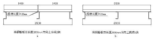 鋼格板長度的設(shè)計(jì)應(yīng)滿足型號的跨距要求,而且扁鋼方向兩端與梁的搭接距離不能少于25毫米。具體設(shè)計(jì)時,可以根據(jù)鋼格板生產(chǎn)工藝和安裝現(xiàn)場施工條件對其長度尺寸進(jìn)行適當(dāng)?shù)恼{(diào)整。如圖所示,方案A將鋼格板沿長度方向拆分為兩塊,這種布置方式方便人工搬運(yùn)。方案B將其設(shè)計(jì)為一個整體,這種方式適用于有起吊設(shè)備的安裝現(xiàn)場,執(zhí)行時相對于方案A簡單,而且整體化設(shè)計(jì)對生產(chǎn)加工而言更容易實(shí)現(xiàn)。在小批量的合同中,設(shè)計(jì)時要避免鋼格板的尺寸過大,尺寸過大無論對于車輛的車廂容積還是運(yùn)輸費(fèi)用都有較高的要求。根據(jù)以上情況綜合考慮,鋼格板的最短不應(yīng)小于鋼梁最小跨度,最大不宜超過4米。