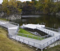 鋼格柵板在國外的遺址保護與展示工程中已經得到廣泛的應用,國內工程中應用尚屬首次。應用鋼格柵板的區域主要是鋼格柵步道。在大遺址區使用的建筑材料有以下要求:其為了保護遺址需少動土,不開挖,鋼格柵板鋪設時不做覆土基礎;其二,鋼格柵板要融入遺址區景觀。為了實現這一需要,鋼格柵板進行表面鈍化處理,同時通過覆土讓格柵板融入環境在設計過程中,通過與施工方、材料廠商溝通合作,選擇合適的鋼格柵板和緊固件以及深化設計格柵板的建構形式和基礎形式,基本實現了設計需要。鋼格柵板通過蝶形扣件和自宮螺絲安裝與預制混凝土基礎塊上,聯系為整體。為了實現鋼格柵板的材質與遺址區氣氛相協調,通過酸腐工藝二次處理鋼格柵板的表面,使其表面呈現啞光效果,做法詳見鋼格柵板材料解析。工程完工數月后的回訪,鋼格柵板步道與遺址區的環境自然融合,基本實現設計效果。