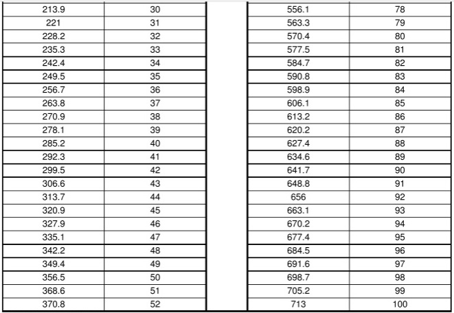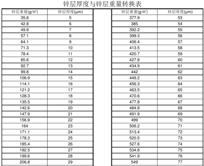 鋅層厚度與鋅層重量轉換表