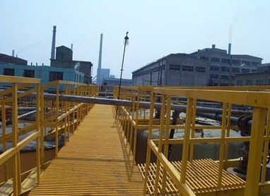 △棧道:化工廠以及其它一些腐蝕嚴重的工廠,每年在設備與設備之間的通道空中棧道(一般為鋼結構)的維護費用相當大,采用FRP格柵制作棧道就可以很好的解決這些問題。