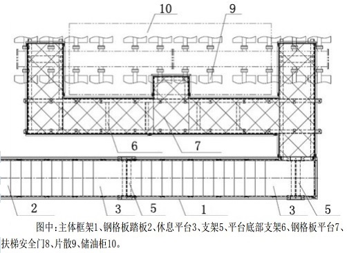 大型電力變壓器的儲油柜通常安裝在很高的位置,為了安裝運行維護方便,同時兼顧安全考慮,一般安裝在片散或冷卻器上方,以片散或冷卻器支架為基礎。操作人員需要通過垂直爬梯或升降車才能到達儲油柜處,這樣對安裝、運行和維護既不方便也不安全。鋼格板維護操作平臺,可供多人同時在儲油柜上進行作業,有效地解決了存在的上述問題。極大地保障了操作員的人身安全,平臺整個結構更加穩固可靠。