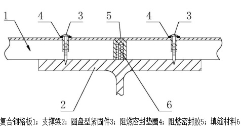 復(fù)合鋼格板的安裝采用圓盤型緊固件固定于支撐梁上,圓盤型緊固件的圓壓盤與花紋鋼板之間設(shè)有耐候阻燃密封墊圈,相鄰兩塊復(fù)合鋼格板之間的縫隙內(nèi)填充有耐候阻燃型填縫材料和填縫用耐候阻燃密封膠,填縫用耐候阻燃密封膠位于耐候阻燃型填縫材料的上方。