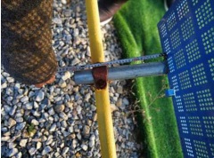 桿件采用48×3鍍鋅鋼管切割每段長度為30cm,固定端采用2mm厚加工成尺寸為50×25×25mm的U形卡槽,U形卡槽寬度比鋼板網外框尺寸大1mm,(鋼板網外框尺寸為24mm)兩個U形卡槽焊接組成一體,U形卡槽通過焊接與短鋼管固定牢固,實際制作完成。