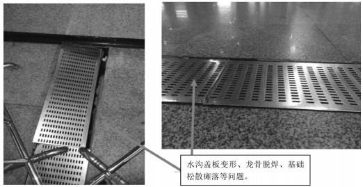 出入口水溝蓋板用于通道橫向截水和排水作用,同時作為通道乘客踩踏的行走面。某路線 23 個車站出入口均有水溝蓋板,蓋板形式均為不銹鋼平板加不銹鋼框龍骨的形式,易產生面板與龍骨脫離的情況,因為面板為平板樣式,一旦面板脫離龍骨,平板會被反復踩踏呈凹形,導致面板四周翹起;同時在長期使用過程中由于乘客大量踩踏容易造成蓋板塌陷、翹角及基礎水泥砂漿松散導致水溝蓋板整體下陷等;類似問題維修矯正難度大,故障易反復出現(xiàn),同時維修不及時又極易產生客傷事件。