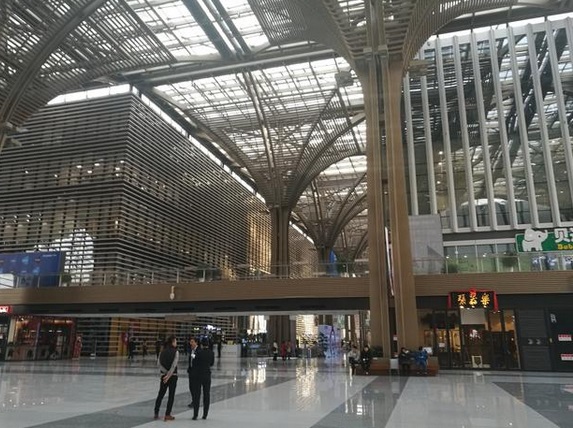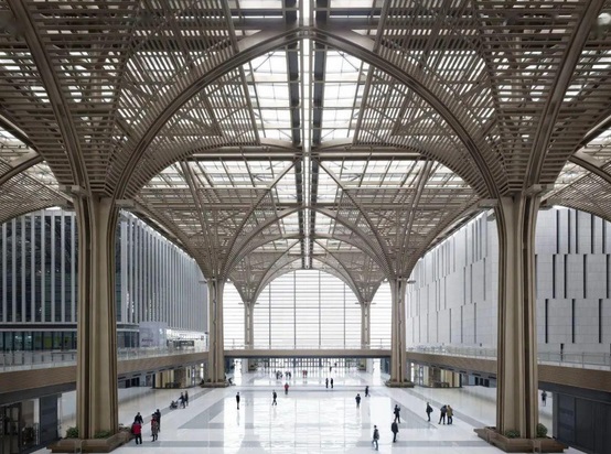 文化長廊由28個獨立鋼結構“傘柱”組成,其中中央大廳上部為10個邊長為30m的大傘,其他部位共分布18個邊長為27m的小傘,橫貫整個文化中心。五棟獨立的文化建筑,通過文化長廊連接,形成一個文化綜合體。每一個單獨的傘柱均有玻璃幕墻系統,鋁合金圓管格柵,排水天溝,鋁板系統等。文化長廊創造既統一又不失多樣性的空間形象,同時塑造四季宜人、舒適的空間環境。