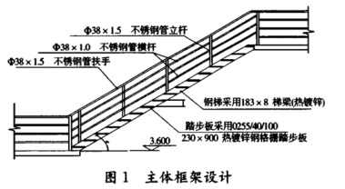 爬梯扶手及立桿采用直徑50mm×3mm 304不銹鋼管,橫桿采用直徑38mm×1.5mm304不銹鋼管。爬梯立桿高為1050mm,立桿間距為1350mm,并用直徑38mm×1.5mm304不銹鋼管,在立桿之間上、中、下設計三道橫桿,桿與桿之間間距為260mm,扶手與斜梁連接采用插接,然后用不銹鋼焊條滿焊。如圖1所示。
