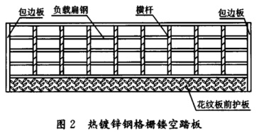 設計踏板時考慮到傳統鋼板積水、積塵、不易清掃等弊端,新型入倉斜爬梯踏板設計為熱鍍鋅鋼格踏板。爬梯踏板長900mm、寬230mm、厚30mm、熱鍍鋅鋼格柵鏤空踏板,6道鋼格兩側用熱鍍鋅鋼板焊接成長方形,鋼格框的前側,兩鋼格之間加焊寬度為50mm條形紋熱鍍鋅鋼板,增加了爬梯主體的穩固性。如圖2所示。鋼格面為波浪狀,每節踏板與熱鍍鋅板斜梁用304不銹鋼螺絲連接,兩節踏步之間高為200 mm。