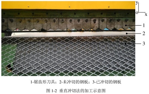 這種方法使用的最為普遍,主要是由于該設備所要求的技術含量不高以及通用性比較好,可加工的板材的厚度范圍較大為0.1mm~8mm,甚至能達到10mm以上,一定范圍內,針對不同規格的鋼板網只需要更換對應的刀具就行,使用垂直沖切法生產鋼板網的加工示意圖如圖1-2所示。