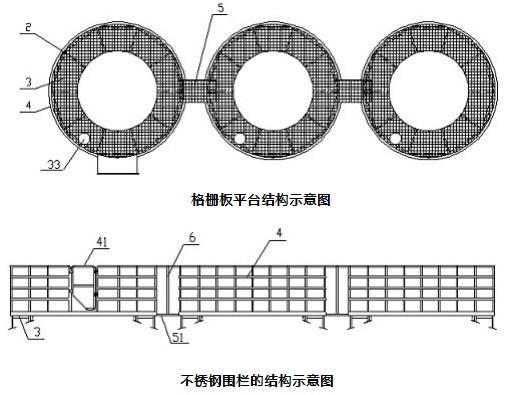 為解決其技術問題,采用一種新型環形格柵板式平臺,環形格柵板式平臺安裝在罐體頂部的上蓋上,包括底框架、可拆卸格柵板和圍欄,圍欄安裝在底框架的外周上。底框架由若干支撐架組件圍成一包圍結構,支撐架組件包括設置在上蓋邊沿的第一連桿和第二連桿,第一連桿的外側端連接第二連桿的左側端,第一連桿和第二連桿在同一水平面上,第一連桿兩端下方設有固定在上蓋頂部的第一豎桿和第二豎桿,可拆卸格柵板呈環形結構,其設置在底框架上表面,可拆卸格柵板的內環邊沿具有向下翻折的內折邊,其外環邊沿具有向上翻折的外折邊,外折邊上開設有與圍欄下部連接的連接孔,圍欄設有供人員進出的入口,入口上安裝有安全門。