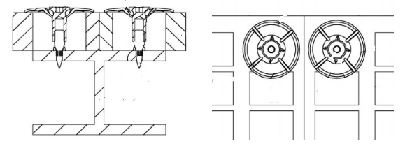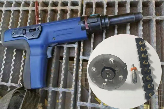 為適應鋼格柵緊固技術的發展,鋼格柵專用射釘緊固器材在國內部分鋼格板工程已經開始引進使用。射釘緊固安裝技術即采用火藥射釘法應用于鋼格柵安裝的創新緊固技術。與傳統的鋼格柵緊固方式相比,安裝技術確保了鋼格柵與鋼梁的最佳緊固效果,施工質量穩定,基本上不受施工人員技能和責任心影響,且整個作業過程十分簡單方便,安裝效率非常高,極大減輕了工人勞動強度,改善了作業環境,節約大量的人力,加快工期,且消除了安全隱患,從而使得本技術具有很高的實用價值。