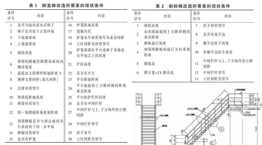 鋼梯改造的主要原因也是核心目的是保證使用者的安全,次要目的是提高鋼梯使用的舒適性,并在此基礎(chǔ)上節(jié)約改造成本。以此為原則,分清改造的主次,將龐大復(fù)雜的數(shù)據(jù)簡單化,提高改造設(shè)計(jì)的效率。下面以唐山某廠區(qū)室外鋼梯改造項(xiàng)目為例展開探索。本項(xiàng)目中,鋼直梯改造149部;鋼斜梯改造34部。