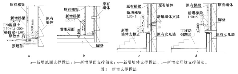 第1類,當(dāng)支撐距基準(zhǔn)面≤2400mm,且第一級踏棍距下端基準(zhǔn)面大于400mm時,增加梯梁至下端基準(zhǔn)面,并且固定。梯梁增加做法見國標(biāo)圖集《鋼梯》。固定梯梁做法分為以下幾類:當(dāng)下端基準(zhǔn)面為地面時節(jié)點(diǎn)圖見圖3a,當(dāng)下端基準(zhǔn)面為屋面時節(jié)點(diǎn)圖見圖3b,當(dāng)下端基準(zhǔn)面為女兒墻時,增加梯梁至女兒墻并且固定(圖3d)或在側(cè)墻增加支撐(圖3c),因基準(zhǔn)面女兒墻較窄,所以考慮在女兒墻所在的屋面上需增加一個可移動的鋼踏步,擴(kuò)大鋼梯下端基準(zhǔn)面,使第一級踏棍距下端基準(zhǔn)面(鋼踏步頂)小于等于400mm。節(jié)點(diǎn)見圖3。