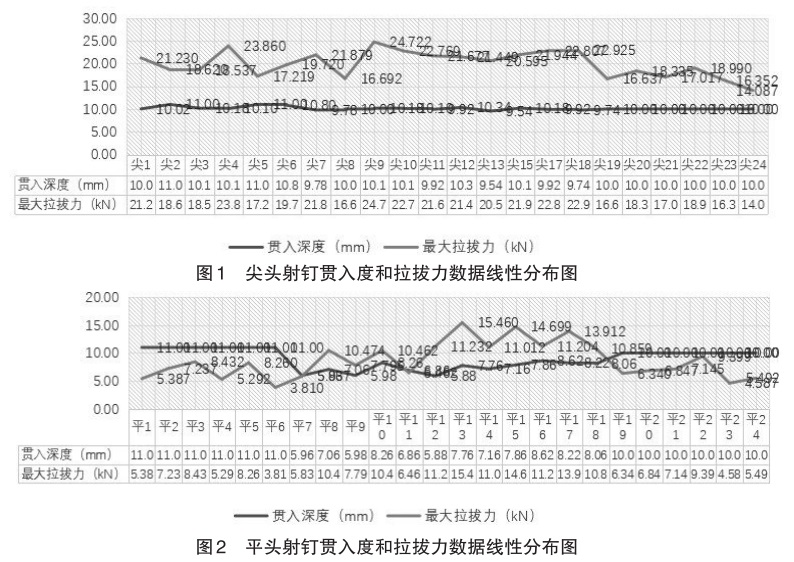 再在實測的24點基礎數據中提取平頭射釘貫入深度和最大拉拔力數值可以發現,尖頭射釘的最大拉拔力均值為8.652kN,基本滿足項目設計要求的8kN數值,滿足現場使用需求,貫入深度和是否穿透對平頭射釘的最大拉拔力影響并不突出,但是垂直度情況對其最大拉拔力有明顯影響,可以從數據線性分布圖(圖2)中發現,存在垂直度問題的試驗點的拉拔力均由明顯下降,受影響程度大。