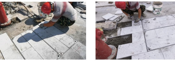 放入蓋體時,應先清理支座內的雜物,避免影響平整度、造成日后開啟困難。在蓋體底板表面涂刷環氧樹脂并均布投撒碎石形成堅固毛糙面,增強面層鋪裝和蓋體底板的抗滑能力。在鋪裝層鋪設前應布設高程控制網,嚴格按控制網高程進行鋪設。按BIM模型鋪設圖樣復核放線,用測量儀器打方格,并用對角線檢驗方格是否方正,定出基準線。每個方格應根據路面預制塊塊型尺寸及道路寬度確定,一般以5m左右為宜。然后在樁橛上標注設計高程,以每個蓋體中點的橫向中心線在路緣石邊設定鋪設路面磚基準點(起始鋪筑點),并往井四周進行鋪設,根據鋪磚的方向通過基準點設置兩條互相垂直的基準線。順路緣石鋪磚時,路緣石即為一條基準線;每個井邊的路緣石的基準點同時鋪筑路面磚時,根據形狀尺寸計算好兩基準點之間的距離,兩基準點的距離不宜過大,不宜超過10m;如距離較大,為控制鋪筑進度,應根據工程規模及塊型尺寸宜加設間距為5~10m的縱、橫平行路面磚的基準線。