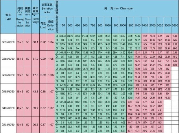 平面型扁鋼中心間距為60mm壓焊鋼格板常用規格安全荷載表