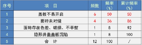 按隱形井蓋原設(shè)計要求,通過三個施工項目部按照不同種類面磚,分別加工制作和安裝施工共計32個隱形井蓋,并進(jìn)行跟蹤檢查,發(fā)現(xiàn)12個存在質(zhì)量問題及不滿足精細(xì)化景觀要求,隱形井蓋驗收合格率為62%,不合格率為38%,分析結(jié)果如下: