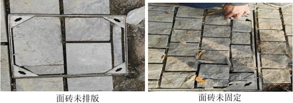 5、原設(shè)計面磚與隱形井蓋之間無砂漿結(jié)合,面磚之間無砂漿填縫,結(jié)合不緊密,易松動。
