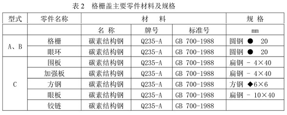 格柵蓋主要零件材料及規格見表2。