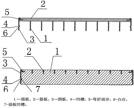 該節(jié)能鋼格板包括強(qiáng)板、筋板及圍板,強(qiáng)板與筋板縱橫交錯(cuò)呈格狀,筋板鑲嵌在強(qiáng)板上,強(qiáng)板和筋板的周邊與圍板插接并提高了強(qiáng)度。上述的筋板、圍板及強(qiáng)板材料的厚度均為2毫米;圍板上部向內(nèi)彎折,向內(nèi)彎折的部分呈“L”型;強(qiáng)板和筋板的兩端分別有凹槽,凹槽與圍板的彎折部分相插接;圍板的中部向內(nèi)凹陷,凹陷后外表面形成凹槽內(nèi)表面形成凸臺(tái),凸臺(tái)與強(qiáng)板凹槽相吻合。