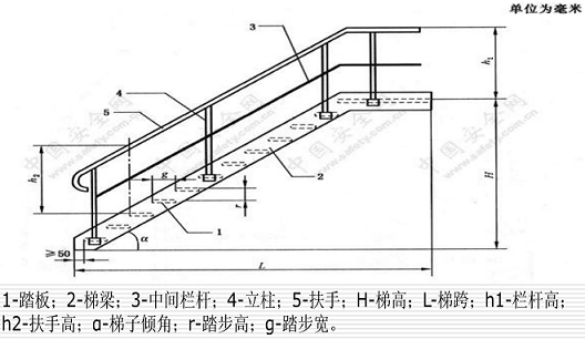 2、梯寬大于1100mm但不大于2200mm的斜梯,無論是否封閉,均應(yīng)在兩側(cè)安裝扶手。梯寬大于2200mm的斜梯,除在兩側(cè)安裝扶手外,在梯子寬度的中心線處應(yīng)設(shè)置中間欄桿。梯子扶手中心線應(yīng)與梯子的傾角線平行,梯子封閉邊扶手的高度由踏板突緣上表面到扶手的上表面垂直測量應(yīng)不小于860mm,不大于960mm。斜梯敞開邊的扶手高度應(yīng)不低于GB4053.3中規(guī)定的欄桿高度。