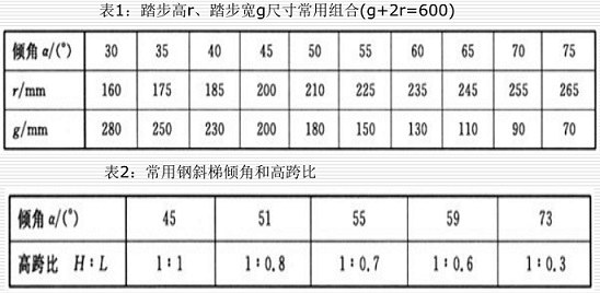 與水平的傾角應(yīng)在30°~75°范圍內(nèi),優(yōu)選傾角為30°~35°。偶爾性進(jìn)入的最大傾角宜為42°。經(jīng)常性雙向通行的最大傾角宜為38°。在同一梯段內(nèi),踏步高與踏步寬的組合應(yīng)保持一致。550≤g+2r≤700 g一踏步寬,單位為毫米;r一踏步高,單位為毫米。