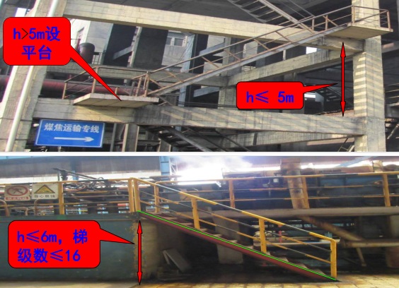 梯高宜不大于5m,大于5m時(shí)宜設(shè)梯間平臺(休息平臺),分段設(shè)梯。單梯段的梯高應(yīng)不大于6m,梯級數(shù)宜不大于16。(圖一:單梯段 圖二:多梯段)