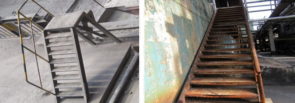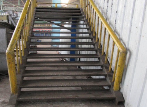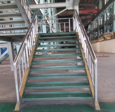 踏板的前后深度應(yīng)不小于80mm,相鄰兩 踏板的前后方向重疊應(yīng)不小于10mm,不大于35毫米.在同一梯段所有踏板間距應(yīng)相同。踏板間距宜為225~255mm。頂部踏板的上表面應(yīng)與平臺平面一致,踏板與平臺間應(yīng)無空隙。踏板應(yīng)采用防滑材料或至少有不小于25mm寬的防滑突緣。應(yīng)采用厚度不小于4mm的花紋鋼板,或經(jīng)防滑處理的普通鋼板,或采用由25mm×4mm扁鋼和小角鋼組焊成的格板或其他等效的結(jié)構(gòu)。