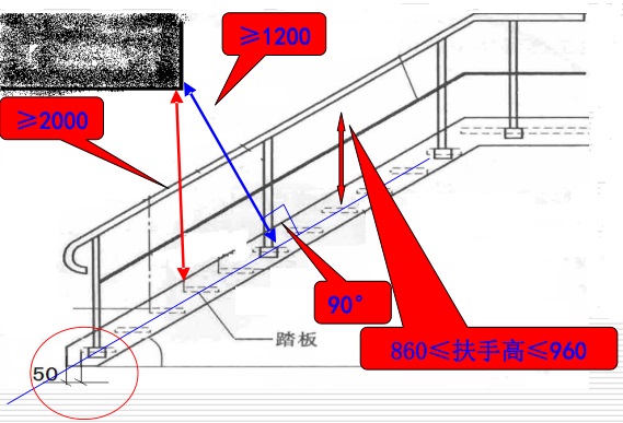 在斜梯使用者上方,由踏板突緣前端到上方障礙物沿梯梁中心線垂直方向測量距離應(yīng)不小于1200毫米;在斜梯使用者上方,由踏板突緣前端到上方障礙物的垂直距離應(yīng)不小于2000毫米.