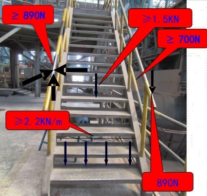 固定式鋼斜梯設(shè)計(jì)載荷應(yīng)按實(shí)際使用要求確定,但應(yīng)不小于本部分規(guī)定的數(shù)值。固定式鋼斜梯應(yīng)能承受5倍預(yù)定活載荷標(biāo)準(zhǔn)值,并不應(yīng)小于施加在任何點(diǎn)的4.4kN集中載荷。踏板中點(diǎn)集中活載荷應(yīng)不小于1.5kN,在梯子內(nèi)側(cè)寬度上均布載荷不小于2.2千牛/米.斜梯扶手應(yīng)能承受在除了向上的任何方向施加的不小于890N集中載荷。中間欄桿應(yīng)能承受在中點(diǎn)圓周上施加的不小于700N水平集中載荷。端部或末端立柱應(yīng)能承受在立柱頂部施加的任何方向上890N的集中載荷。以上載荷不進(jìn)行疊加。