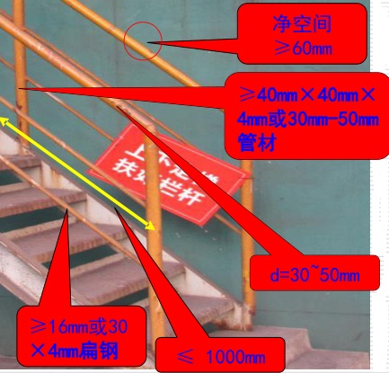 3、扶手應(yīng)沿著其整個(gè)長度方向上連續(xù)可抓握。在扶手外表面與周圍其它物體間的距離應(yīng)不小于60mm。扶手宜為外徑30mm~50mm,壁厚不小于2.5mm的圓形管材。對于非圓形截面的扶手,其周長應(yīng)為100mm~160mm。非圓形截面外接圓直徑應(yīng)不大于57mm,所有邊緣應(yīng)為圓弧形,圓角半徑不小于3毫米.支撐扶手的立桿宜采用截面不小于40mm×40mm×4mm角鋼或外徑為30mm~50mm的管材。從第一級踏板開始設(shè)置,間距不宜大于1000mm。中間欄桿采用直徑不小于16mm圓鋼或30mm×4mm扁鋼,固定在立柱中部。