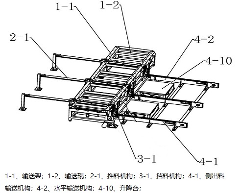 側出料輸送機構,設置于輸送架的一側,側出料輸送機構包括用于堆放鋼格板板材的升降臺以及分布在升降臺兩側的水平輸送機構;當鋼格板在升降臺上被降至水平輸送機構上時,通過水平輸送機構朝遠離輸送架一側送走鋼格板;